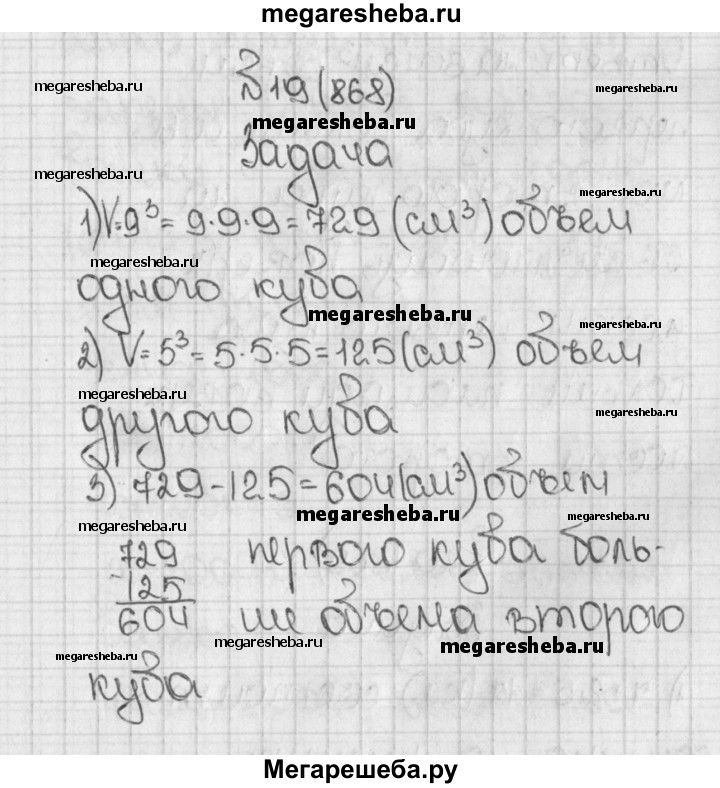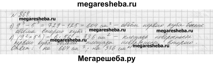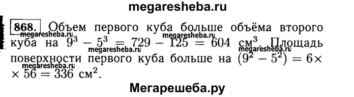 868. Сторона одного куба 9 см, а другого 5 см: На сколько объём первого куба больше объёма второго? На сколько площадь поверхности первого куба больше площади поверхности второго?