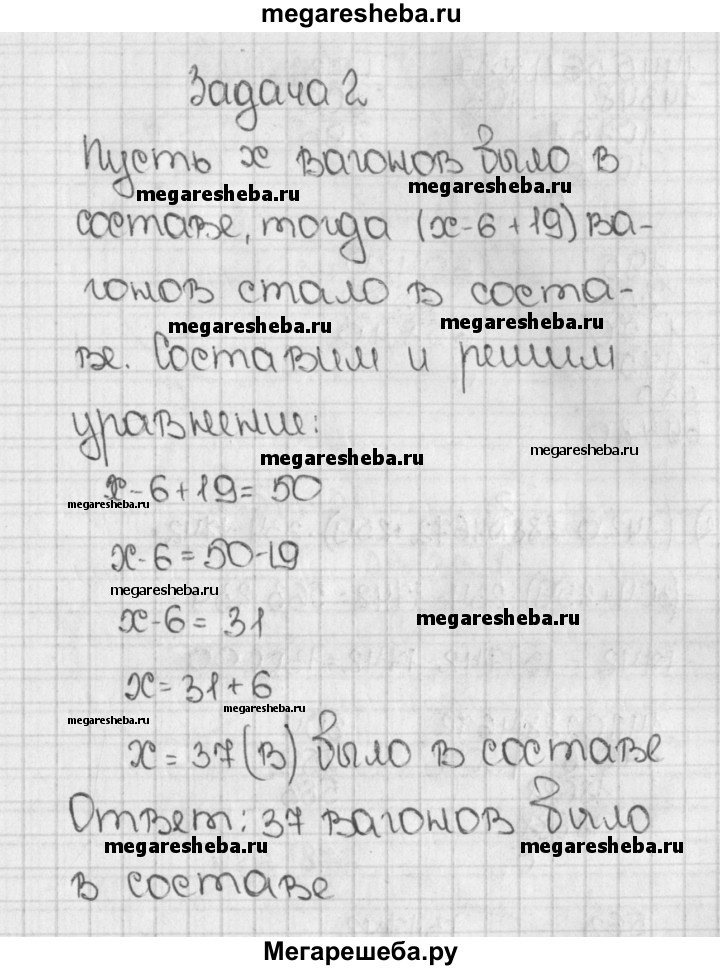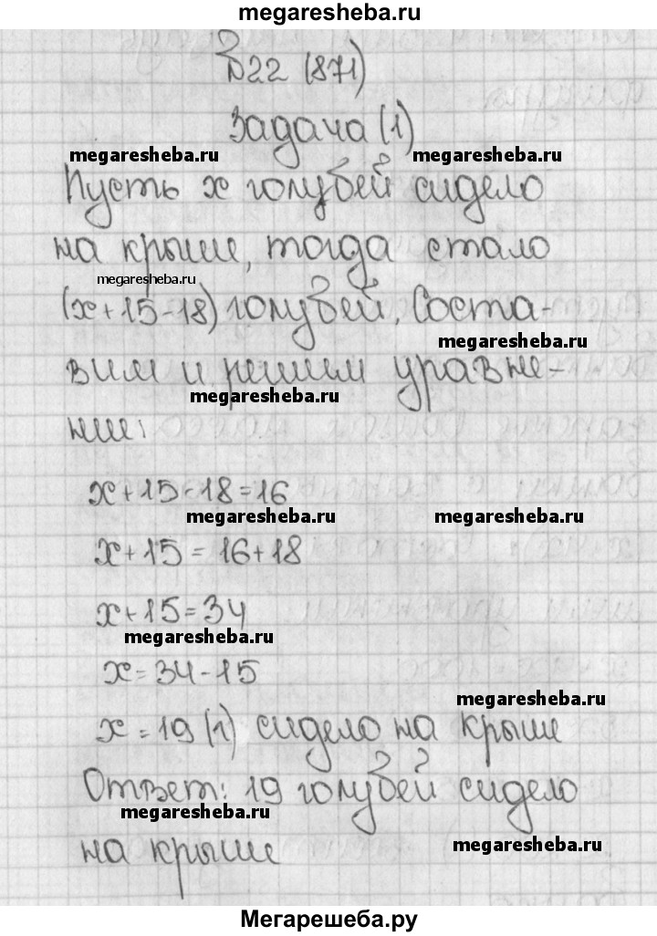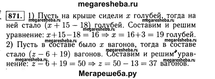 871. Решите задачу: 1) На крыше дома сидели голуби. Когда к ним прилетели ещё 15 голубей, а 18 голубей улетели, то на крыше оказалось 16 голубей. Сколько голубей сидело на крыше первоначально? 2) Когда от товарного состава отцепили 6 вагонов, а прицепили к нему 19 вагонов, в нём стало 50 вагонов. Сколько вагонов было в составе первоначально?