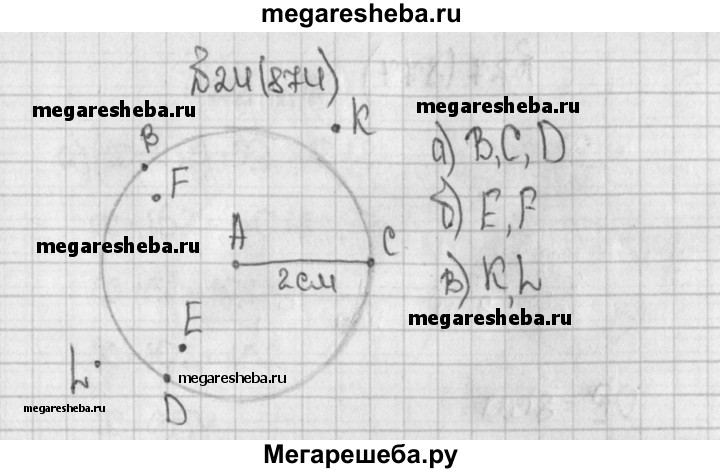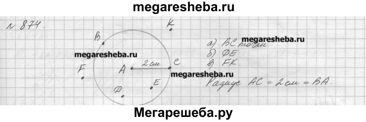 874. Начертите круг с центром А и радиусом 2 см. Отметьте две точки: а) лежащие на окружности; б лежащие внутри круга; в) лежащие вне круга.