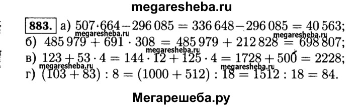 883. Найдите значение выражения: а) 507 * 664 - 296 085; в) 123 + 53 * 4; б) 485 979 + 691 * 308; г) (103 + 83) : 18.