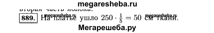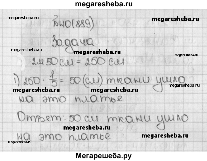 889. Купили кусок ткани длиной 2 м 50 см и из 1/5 куска сшили платье для куклы. Сколько сантиметров ткани ушло на это платье?