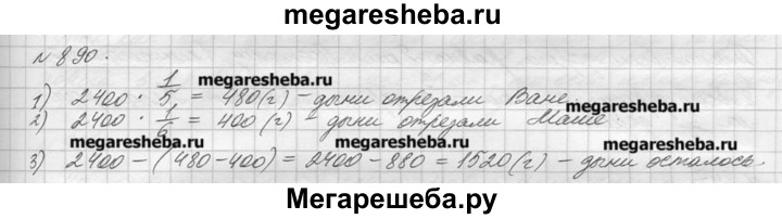 890. Купили дыню массой 2 кг 400 г. Ване отрезали 1/5 дыни, а Маше — 1/6 дыни. Чему равна масса каждого отрезанного куска? Сколько граммов дыни осталось?