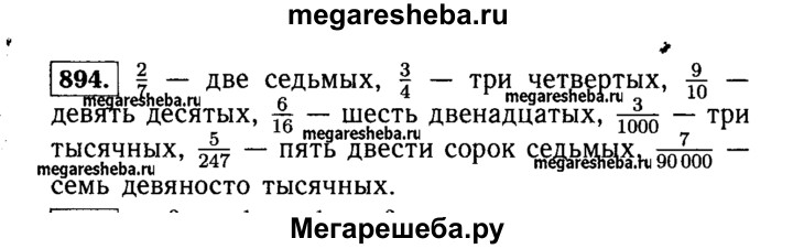 894. Прочитайте дроби: 2/7, 3/4, 9/10, 6/12, 3/1000, 5/247, 7/90 000. Назовите числитель и знаменатель каждой дроби.