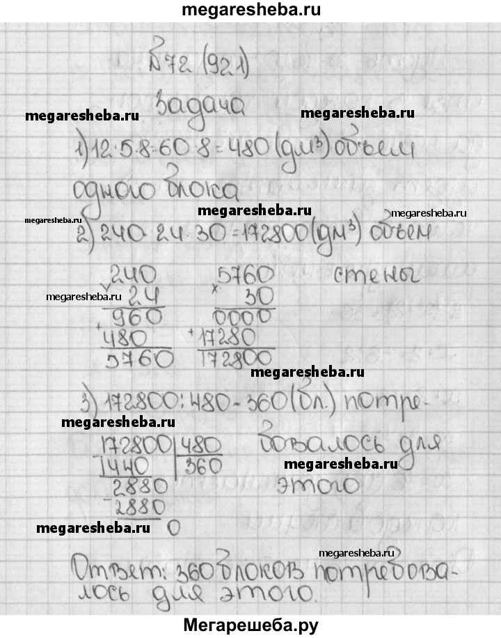 921. Бетонный блок имеет длину 12 дм, ширину 8 дм и высоту 5 дм. Из таких блоков сложили стену длиной 240 дм, шириной 24 дм и высотой 30 дм. Сколько блоков потребовалось для этого?