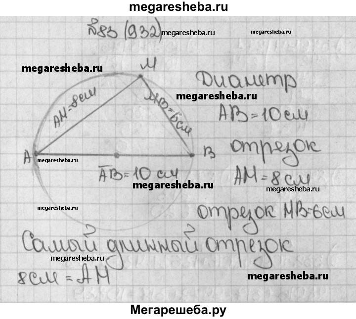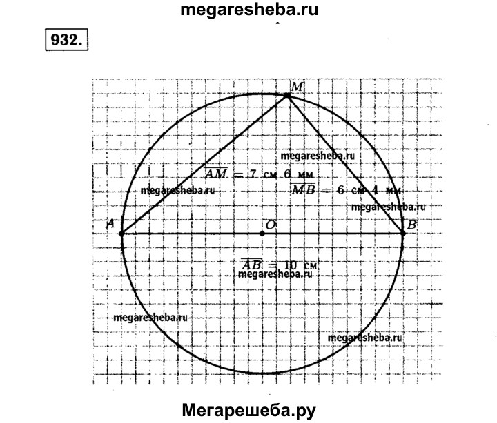 932. Постройте круг радиусом 5 см. Проведите в нём диаметр АВ. Отметьте на окружности точку М и соедините её с точками А и В. Измерьте: диаметр АВ, отрезок AM, отрезок MB. Какой из этих отрезков самый длинный?