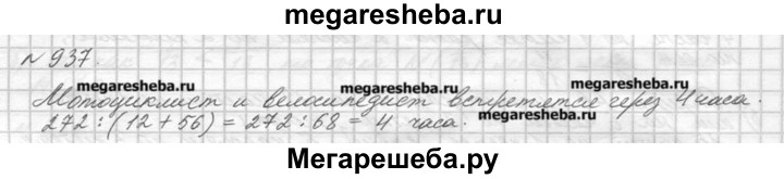937. Мотоциклист и велосипедист едут навстречу друг другу. Через сколько часов они встретятся, если расстояние между ними 272 км, скорость велосипедиста 12 км/ч, а скорость мотоциклиста 56 км/ч?