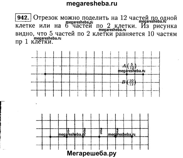 942. Единичный отрезок равен 12 клеткам. Отметьте на координатном луче точки A(5/6) и B(10/12). Объясните результат.