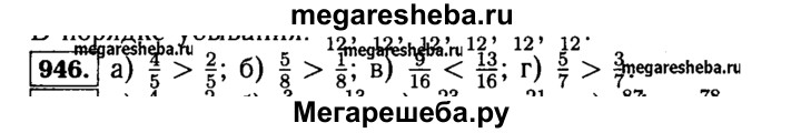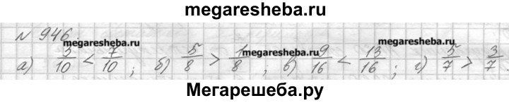 946. Замените звёздочку знаком < или > в записях: a)3/10*7/10; ; 6)5/8*1/8; в) 9/16*13/16; г)5/7*3/7.