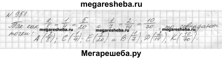 951. На координатном луче отмечены следующие точки: А(2/8); B(1/7); C1/4(); D(2/14); E(5/20); K(10/70). Есть ли среди них совпадающие?