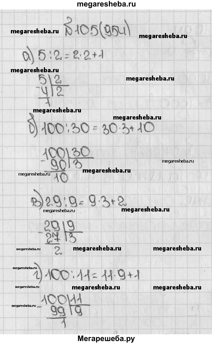 954. Выполните деление с остатком: а) 5 на 2; б) 100 на 30; в) 29 на 9; г) 100 на 11.