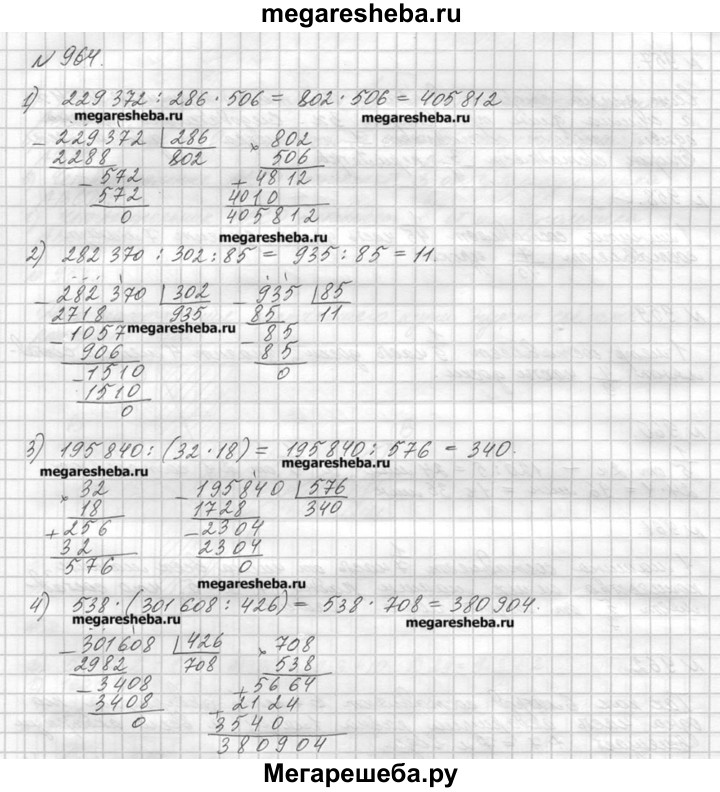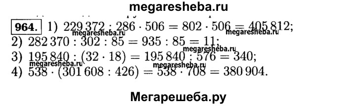 964. Выполните действия: 1) 229 372 : 286 * 506; 3) 195 840 : (32 * 18); 2) 282 370 : 302 : 85; 4) 538 *(301 608 : 426).
