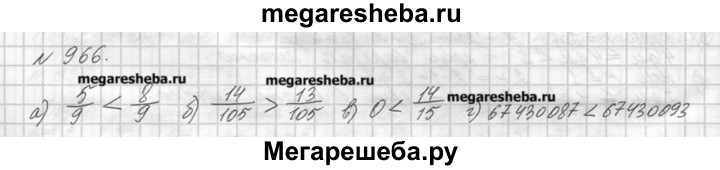 966. Поставьте вместо звёздочек знаки < или > так, чтобы получилось верное неравенство: а)5/9*8/9; б) 14/105*13/105; ; в) 0*14/15; г)67 430 087*67 430 093.