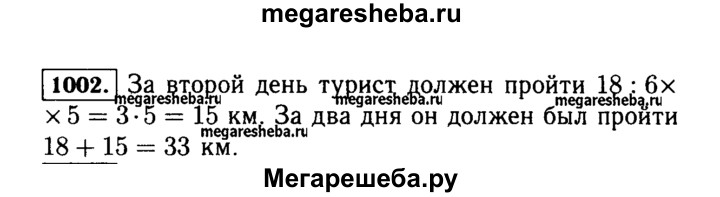1002. Турист прошёл за первый день 18 км, что составляет 6/5 пути, который он должен пройти во второй день. Сколько километров должен пройти турист за эти два дня?