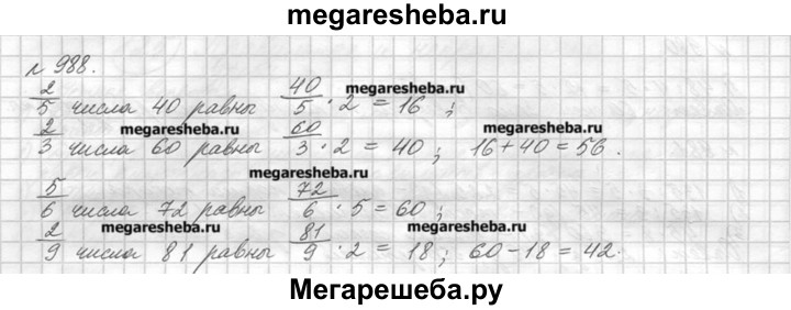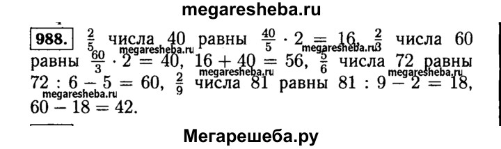 988. Сложите 2/5 числа 40 и 2/3 числа 60. Из 5/6 числа 72 вычтите 2/9 числа 81.