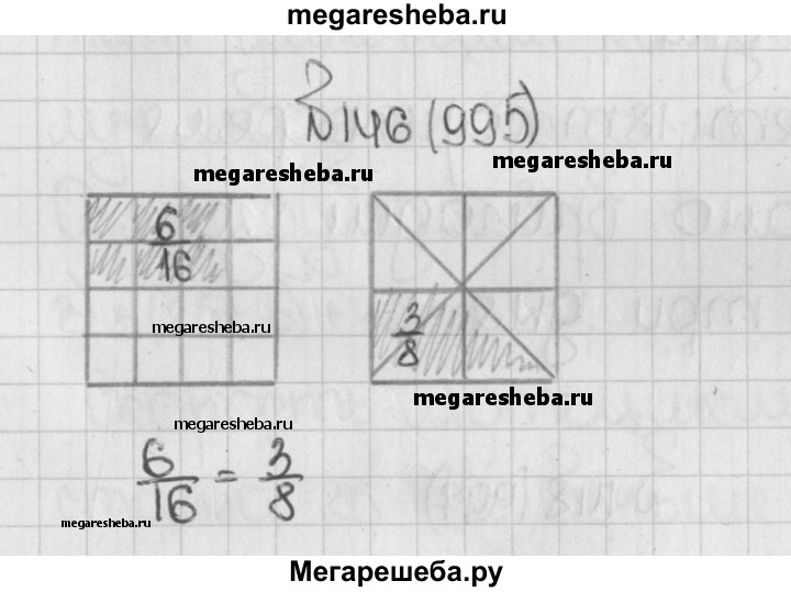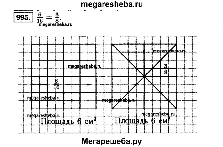 995. Начертите квадрат со стороной 4 см. Покажите на чертеже: 6/16 квадрата, 3/8 квадрата. Найдите площади этих частей квадрата и объясните полученный результат.