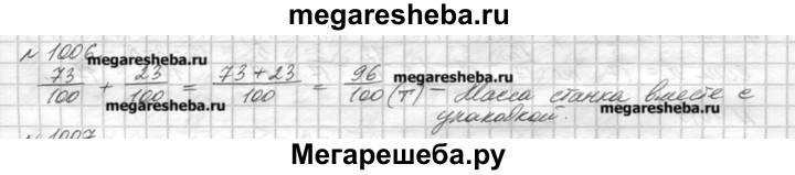 1006. Масса станка равна 73/100 т, а масса его упаковки 23/100 т. Найдите массу станка вместе с упаковкой.