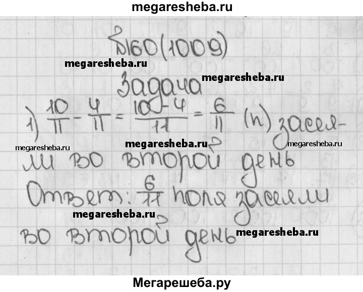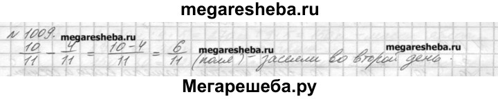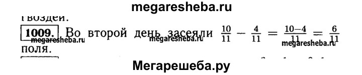 1009. За два дня засеяли 10/11 поля. В первый день засеяли 4/11 поля. Какую часть поля засеяли во второй день?