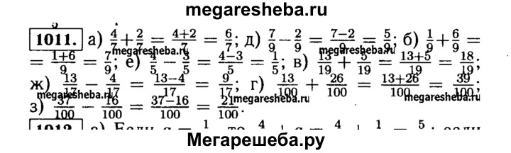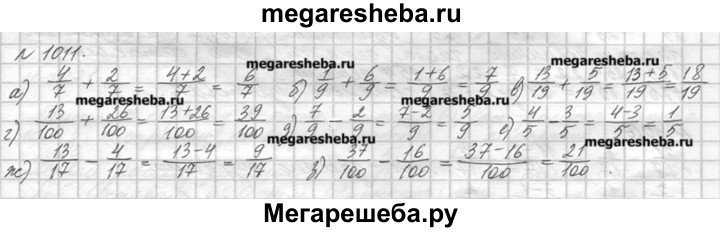 1011. Выполните действие: а) 4/7+2/7; б)1/9+6/9; в)13/19+5/19; г)13/100+26/100; д)7/9-2/9; е)4/5-3/5; ж)13/17-4/17; з)37/100-16/100;