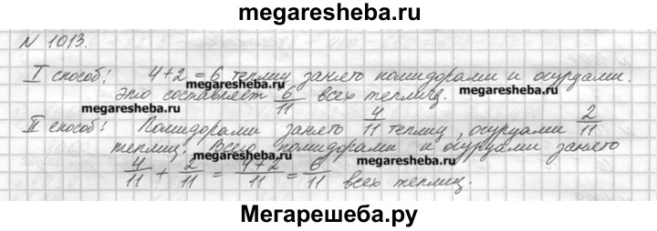 1013. Из 11 теплиц овощеводческого хозяйства 4 засажены помидорами, а 2 — огурцами. Какая часть теплиц занята огурцами и помидорами? Решите задачу двумя способами.
