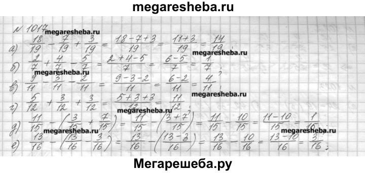 1017. Выполните действия: а) 18/19 – 7/19 + 3/19; в) 9/11 – 3/11 – 2/11; д)11/15 – (3/5+7/15); 6)2/7 + 4/7 – 5/7; г)5/15 + 3/12 + 3/12; е) 13/16 – (13/16 – 3/16).