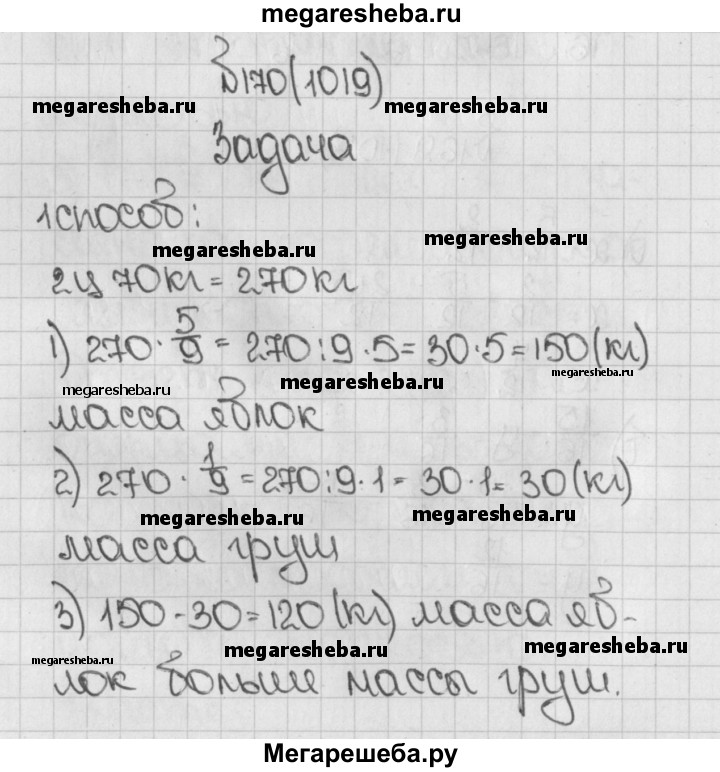1019. В палатке было 2 ц 70 кг фруктов. Яблоки составляли 5/9 всех фруктов, а груши — 1/9 всех фруктов. На сколько масса яблок больше массы груш? Решите задачу двумя способами.