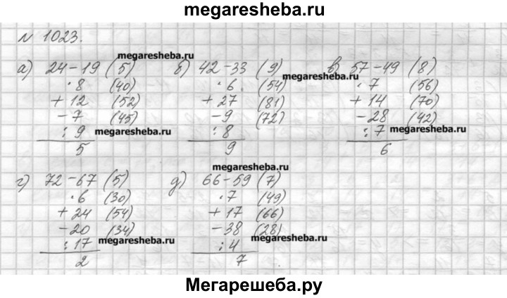 1023. Вычислите устно: а) 24 - 19* 8+ 12- 17: 9/? в) 57 – 49*7+14- 28: 7/? д) 66 - 59*7+17- 38: 4/? б) 42 - 33*6+ 27- 9: 8/? г) 72 - 67-6+24- 20: 17/?