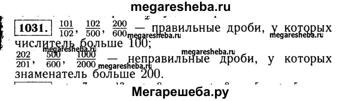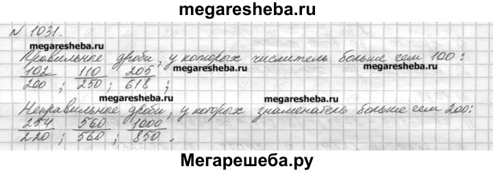 1031. Назовите 3 правильные дроби, числитель которых больше, чем 100. Назовите 3 неправильные дроби, знаменатель которых больше, чем 200.