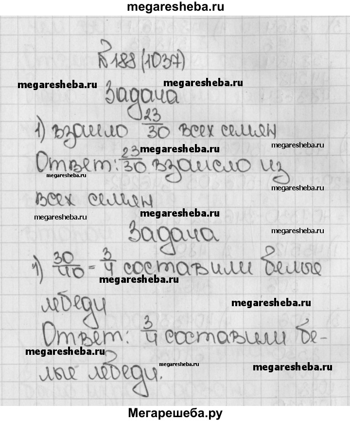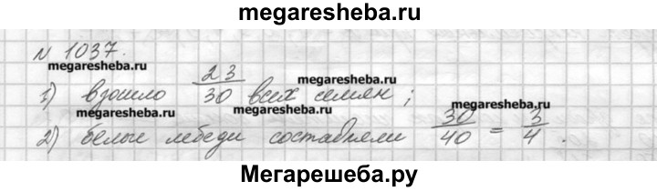 1037. Решите задачу: 1) Из 30 высаженных семян взошли 23. Какая часть высаженных семян взошла? 2) На пруду плавали 40 лебедей. Из них 30 были белыми. Какую часть всех лебедей составляли белые лебеди?