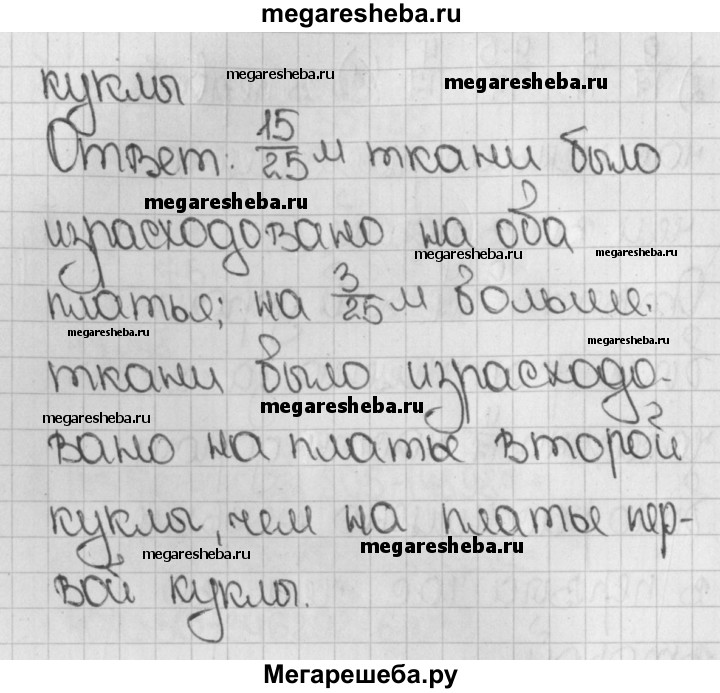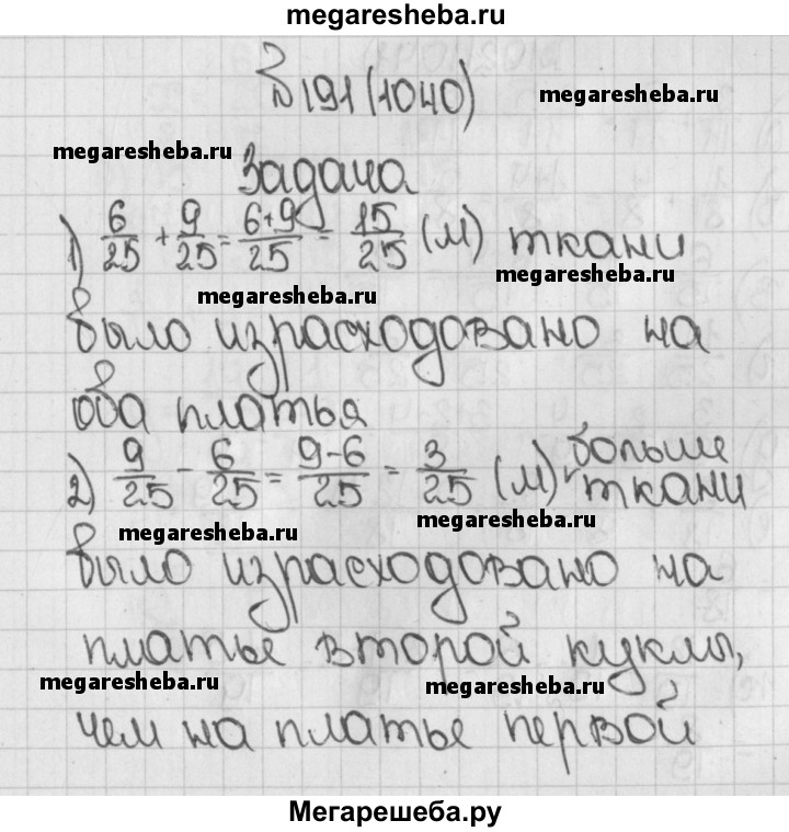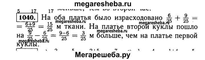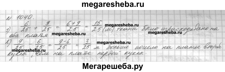 1040. На платье для первой куклы было израсходовано 6/25 м ткани, а на платье для второй куклы 9/25 м ткани. Сколько ткани было израсходовано на оба платья? На сколько больше ткани было израсходовано на платье второй куклы, чем на платье первой куклы?