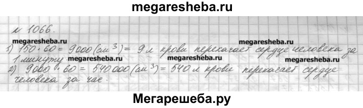 1066. За одно сокращение сердце человека выталкивает 150 см3 крови. Сколько крови перекачивает сердце человека за 1 мин, за 1 ч при пульсе 60 (пульс — число сокращений сердца за 1 мин)?