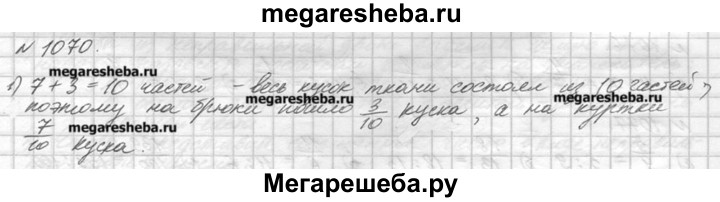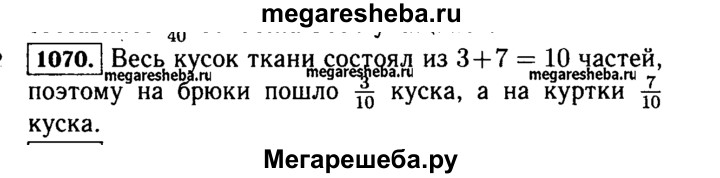 1070. Кусок джинсовой ткани разрезали на равные части. Из 3 частей сшили брюки, а из 7 остальных частей — куртки. Какую часть материи израсходовали на брюки и какую на куртки?