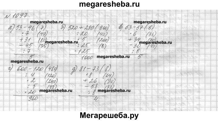 1097. Вычислите устно: а) 53 - 46 * 7 + 31 - 45: 7/? в) 63 - 57 * 6 + 34 - 30 : 8/? Д) 81 - 73 * 8 + 26 - 58 : 8/? б) 520 + 280 : 20 * 5 : 25 * 125/? г) 600-120 : 4* 2 : 5 * 20/?
