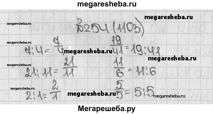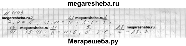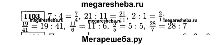 1103. Запишите в виде дроби частные 7:4, 21 : 11,2: 1 ив виде частного дроби 19/41; 11/6; 5/5; 28/7.