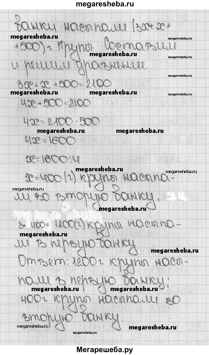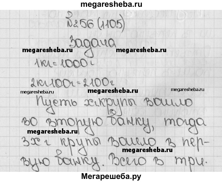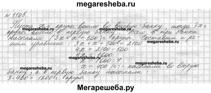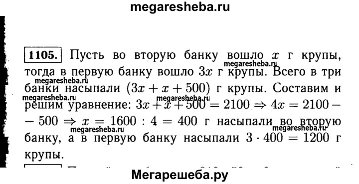 1105. Купили 2 кг 100 г крупы и высыпали её в три банки. В первую банку крупы вошло в 3 раза больше, чем во вторую, а в третью банку насыпали 500 г крупы. Сколько крупы насыпали в первую и сколько во вторую банки?