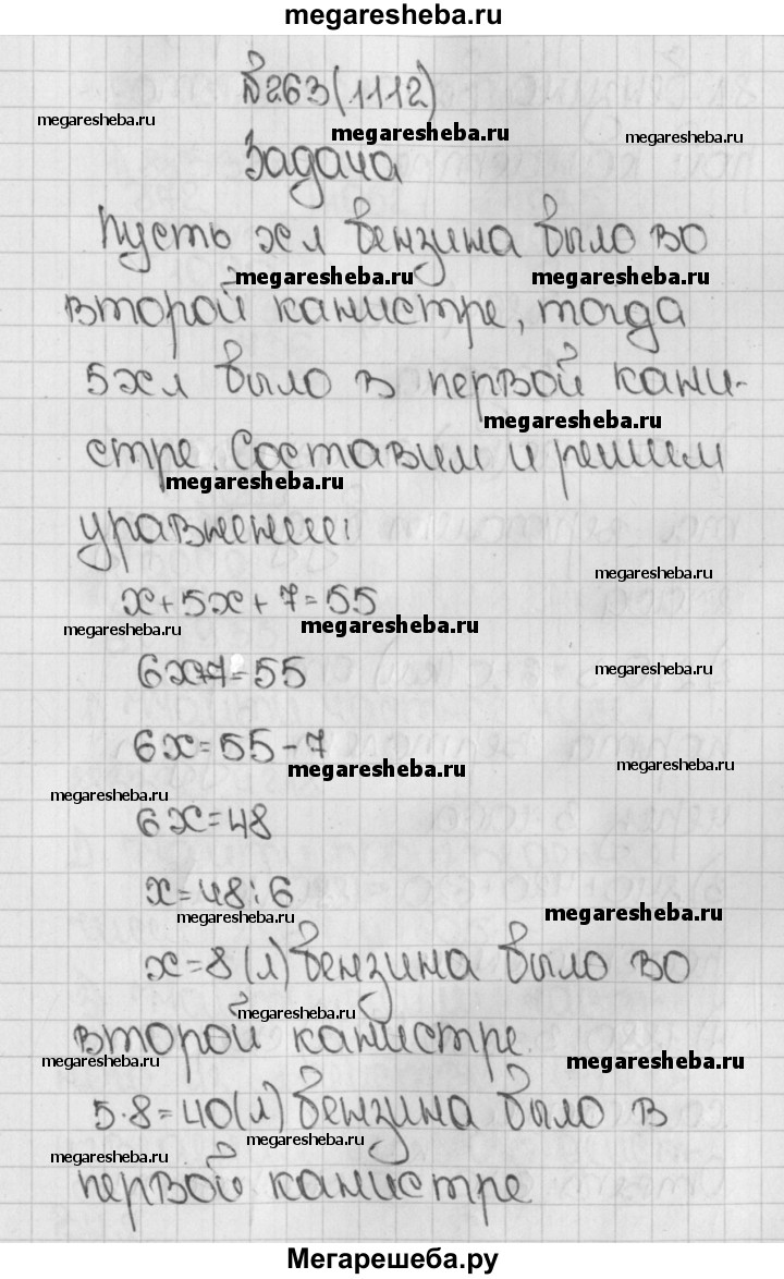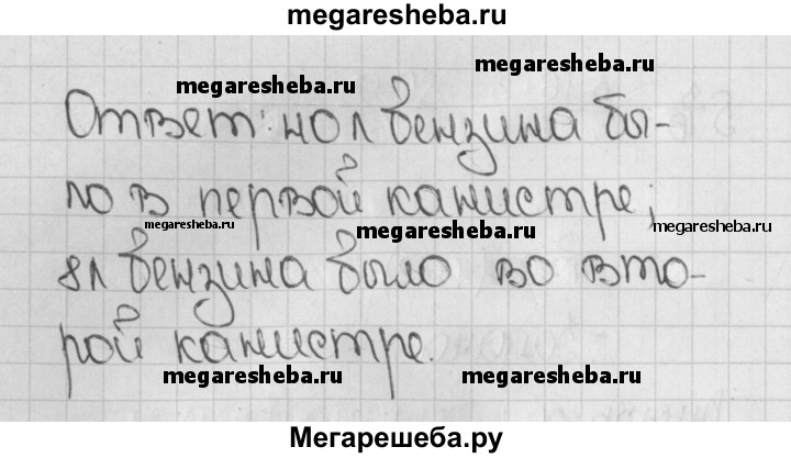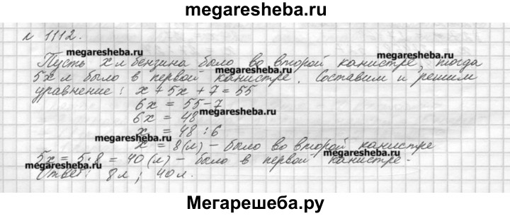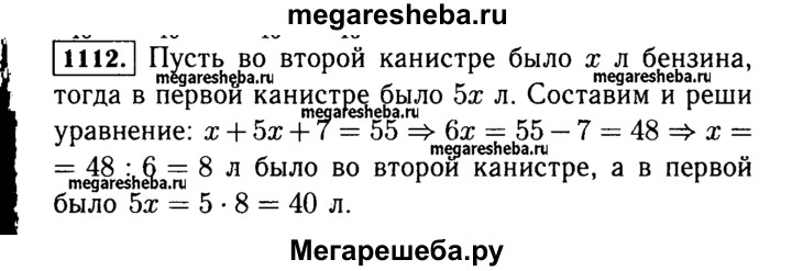 1112. В первой канистре было в 5 раз больше бензина, чем во второй. Весь бензин из этих канистр вылили в пустой бензобак автомашины. Если в этот бак долить ещё 7 л бензина, то он окажется полным. Сколько литров бензина было в каждой канистре, если ёмкость бензобака 55 л?