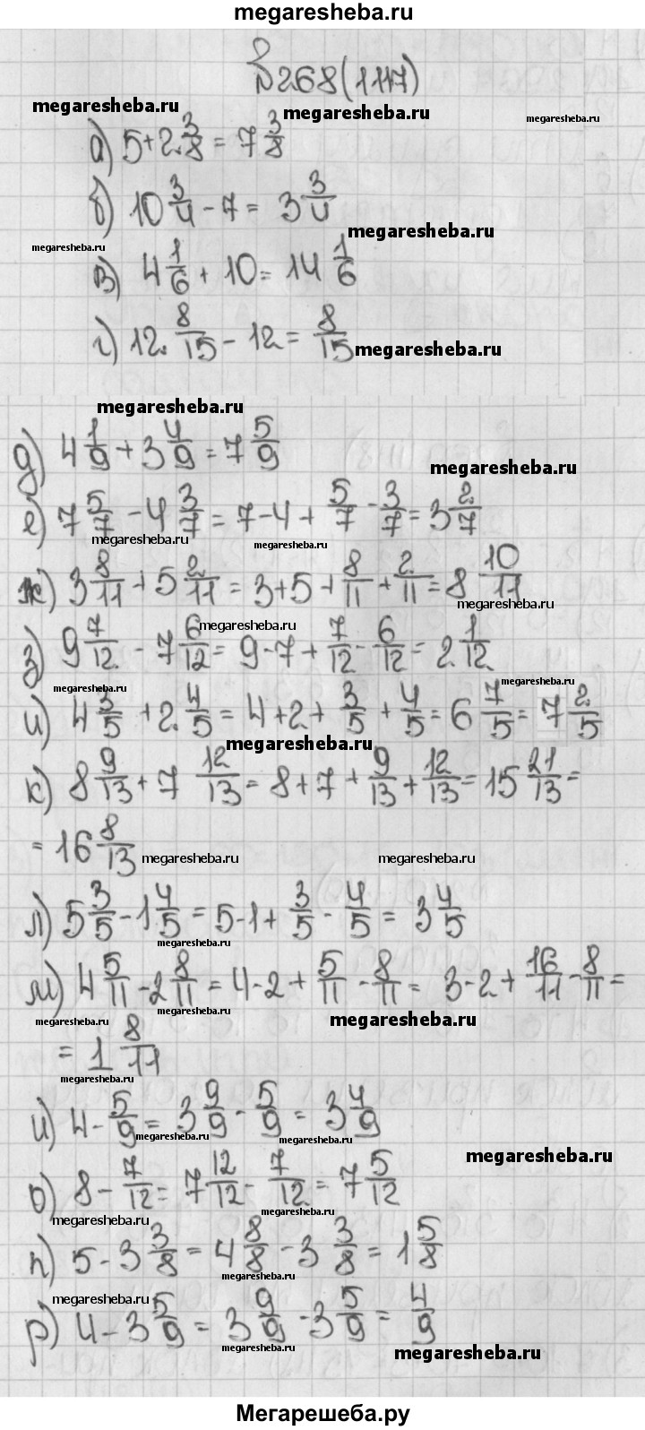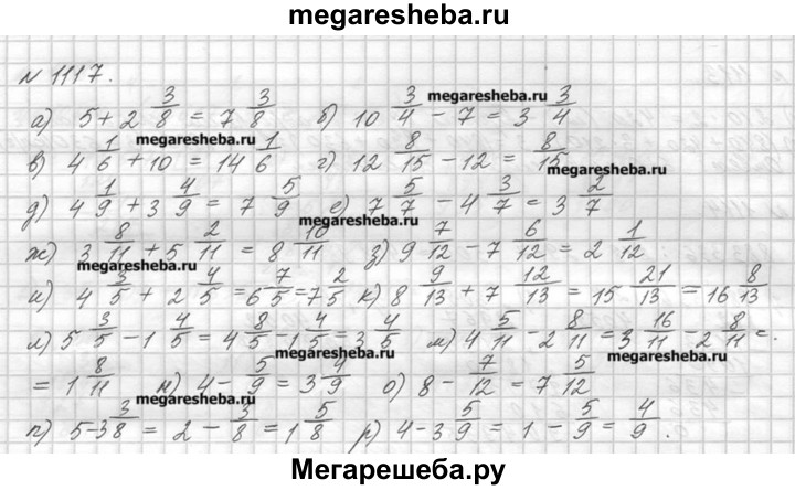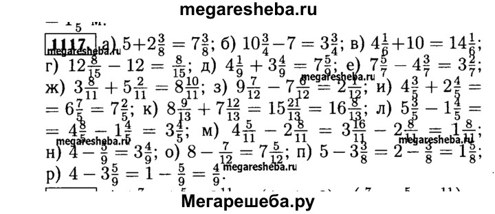 1117. Выполните действия: а)5 + 2*3/8 ж) 3*8/11 + 5*2/11 м) 4*5/11 – 2*8/11 б)10*3/4 - 7 з)9*7/12 – 7*6/12 в) 4*1/6 + 10 и)4*3/5 + 2*4/5 о) 8 – 7/12 г) 12*8/15 - 12 к)8*9/13 + 7*12/13 д)4*1/9+3*4/9 л) 5*3/5-1/4/5 р) 4 – 3*5/9 е) 7*5/7 – 4*3/4