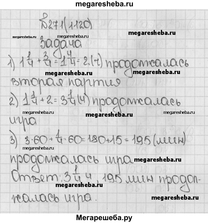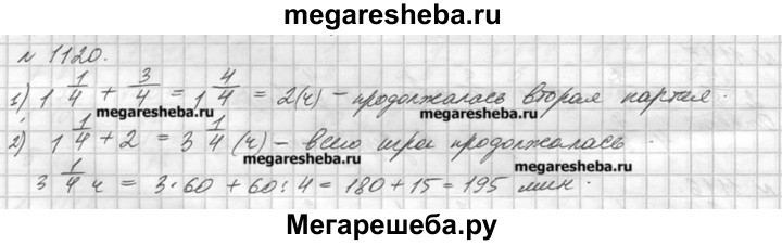 1120. Два шахматиста сыграли две партии: первая партия продолжалась 1*1/4 ч, а вторая — на 3/4 ч больше. Сколько часов продолжалась игра? Выразите продолжительность игры в минутах.