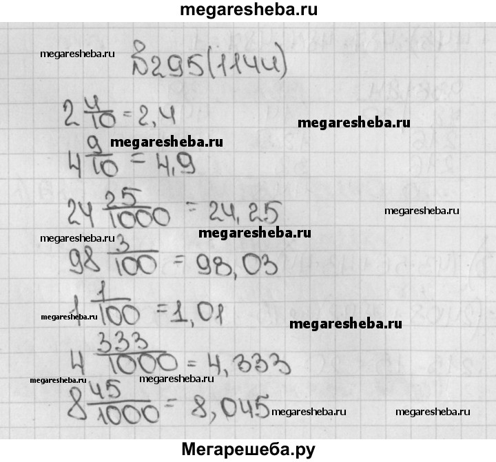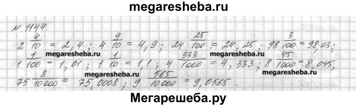 1144. Запишите в виде десятичной дроби: 2*4/10; 4*9/10; 24*25/100; 98*3/100; 1*1/100; 1*1/10; 4*333/1000; 8*45/1000; 75*8/10000; 9*565/10000.
