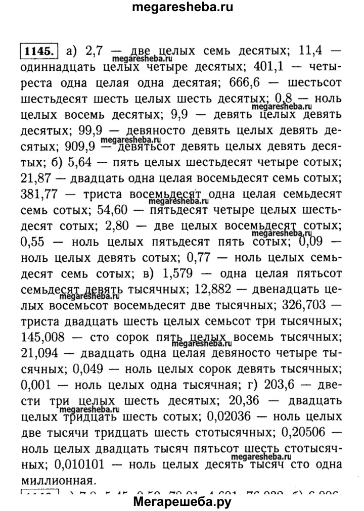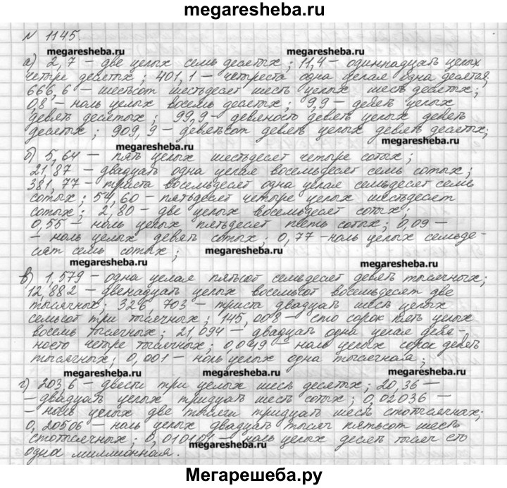 1145. Прочитайте десятичные дроби: а) 2,7; 11,4; 401,1; 666,6; 0,8; 9,9; 99,9; 909,9; б) 5,64; 21,87; 381,77; 54,60; 2,80; 0,55; 0,09; 0,77; в) 1,579; 12,882; 326,703; 145,008; 21,094; 0,049; 0,001; г) 203,6; 20,36; 0,02036; 0,20506; 0,010101.