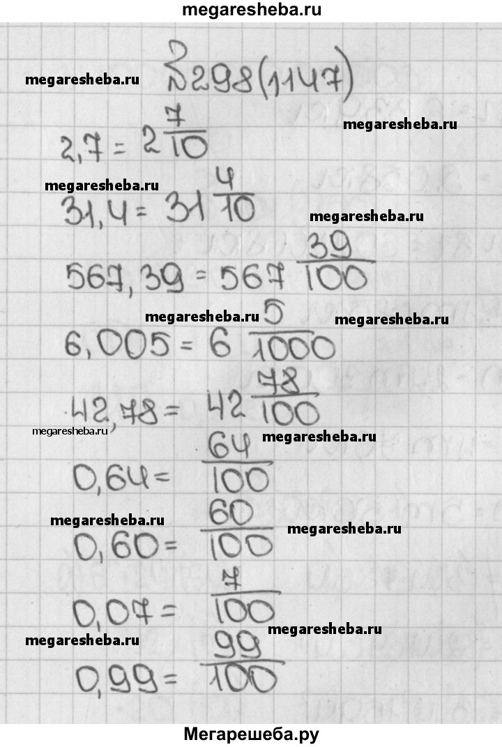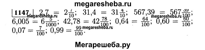1147. Запишите в виде дроби или смешанного числа: 2,7; 31,4; 567,39; 6,005; 42,78; 0,64; 0,60; 0,07; 0,99.