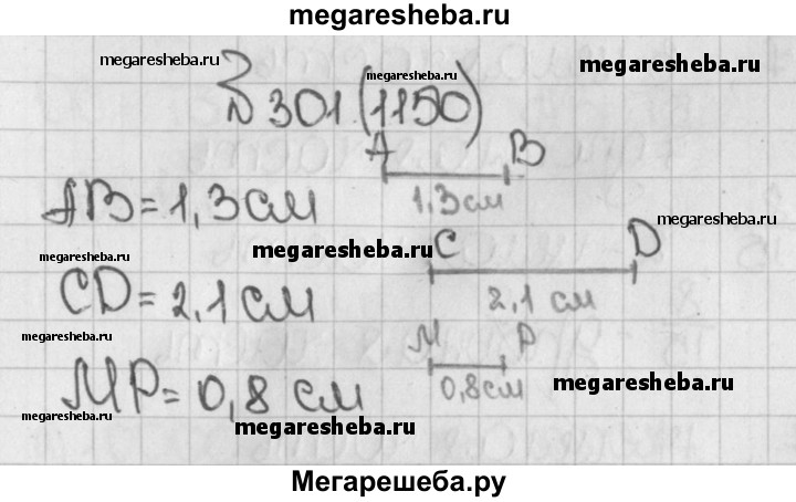 1150. Начертите отрезки: АВ = 1,3 см; CD = 2,1 см; MP = 0,8 см.