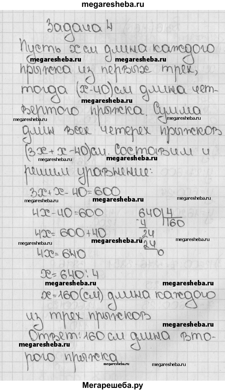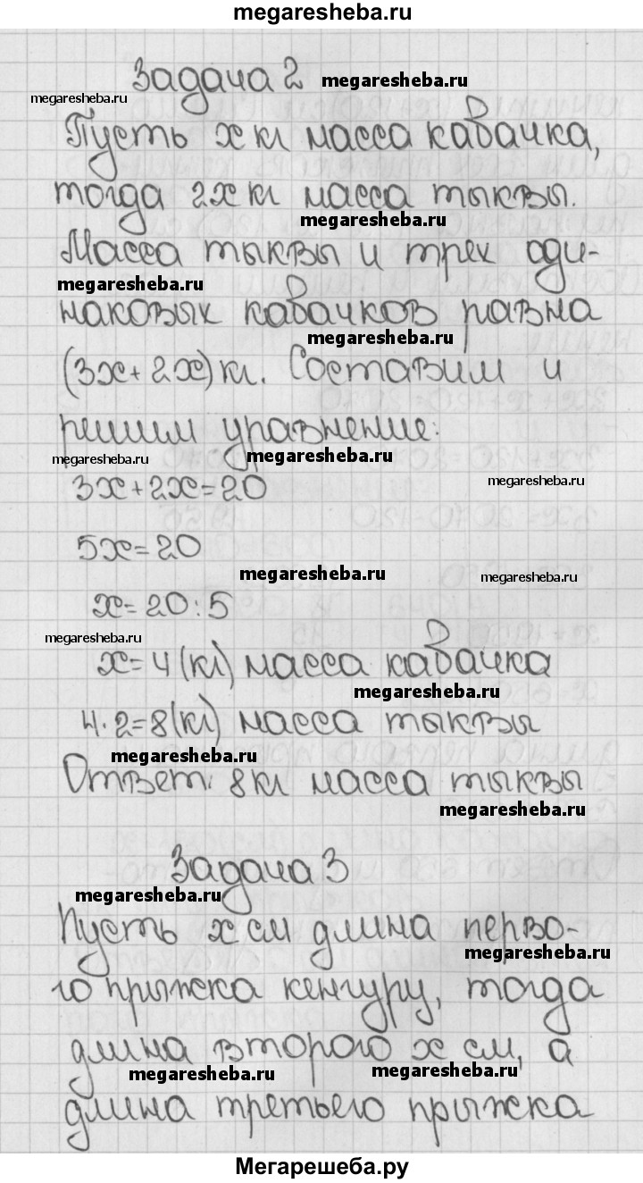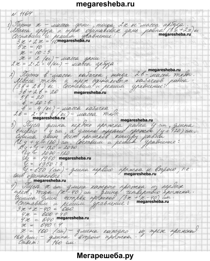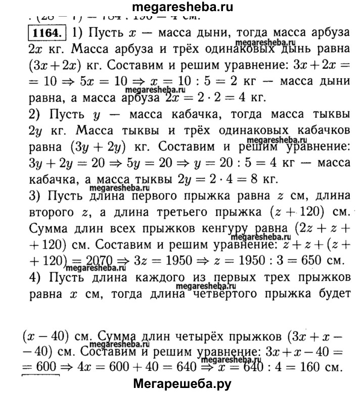 1164. Решите задачу: 1) Масса арбуза и трёх одинаковых дынь 10 кг. Дыня в 2 раза легче арбуза. Какова масса арбуза? 2) Масса тыквы и трёх одинаковых кабачков 20 кг. Тыква в 2 раза тяжелее кабачка. Какова масса тыквы? 3) За три прыжка кенгуру преодолел расстояние 20 м 70 см. Первые два прыжка оказались одинаковыми, а третий — на 1 м 20 см длиннее. Какова длина второго прыжка кенгуру? 4) Расстояние до норы в 6 м заяц преодолел в четыре прыжка. Первые три прыжка оказались одинаковыми, а последний на 40 см короче остальных. Найдите длину второго прыжка зайца.