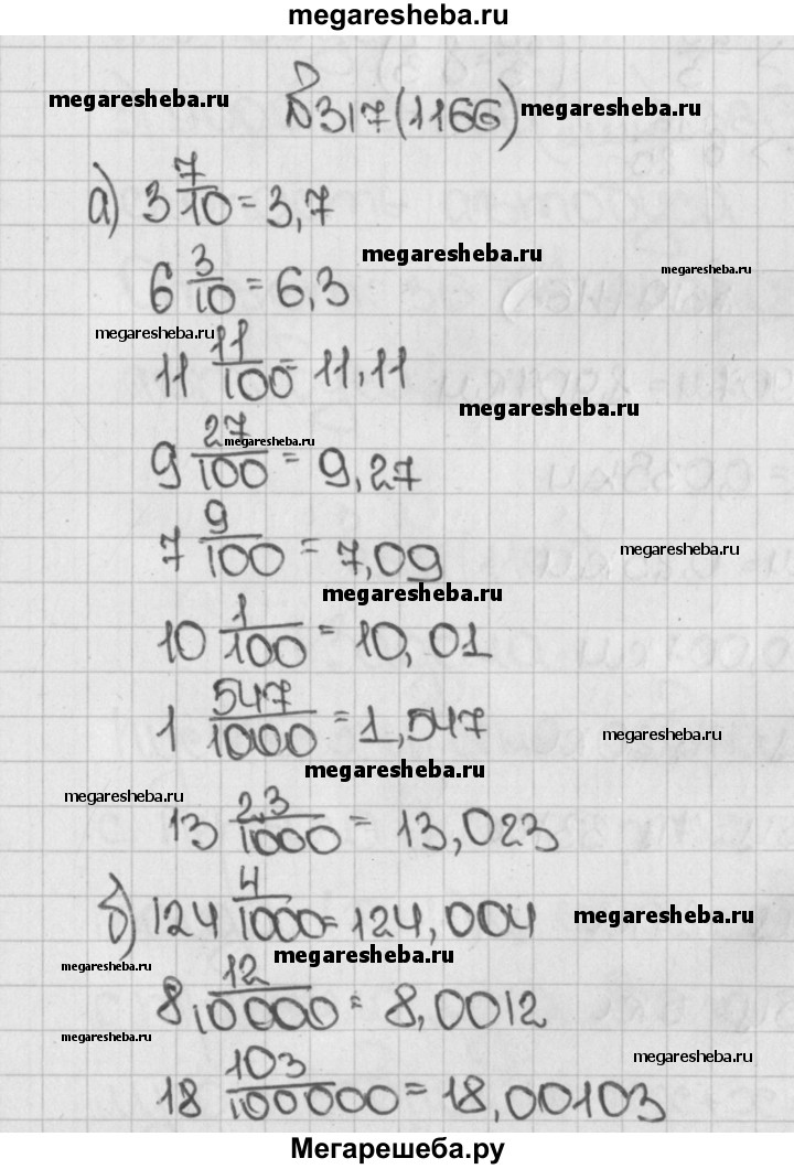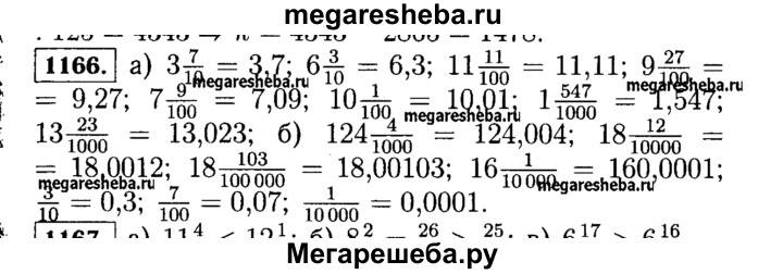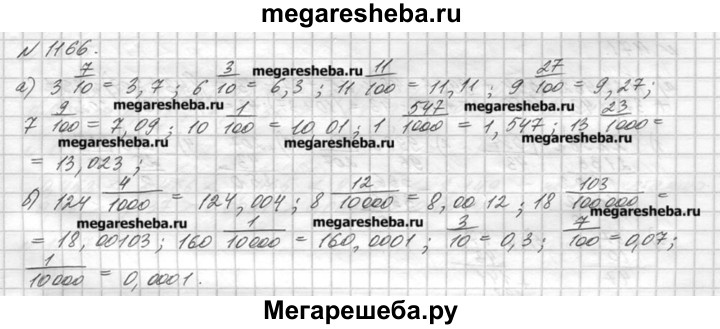 1166. Запишите в виде десятичной дроби числа: а) 3*7/10; 6*3/10; 11*11/100; 9*27/100; 7*9/100; 10*1/100; 1**547/1000; 13*23/1000; б) 124*4/1000; 8*12/10000; 18*103/100000; 160*1/10000; 3/10; 7/100; 1/10000.
