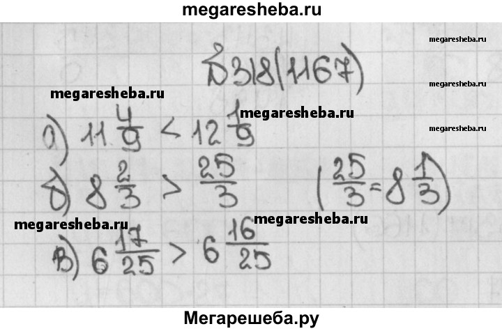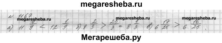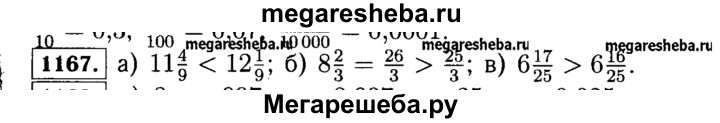 1167. Сравните: а) 11*4/9 и 12*1/9; б) 8*2/3 и 25/3; в) 6*17/25 и 6*16/25