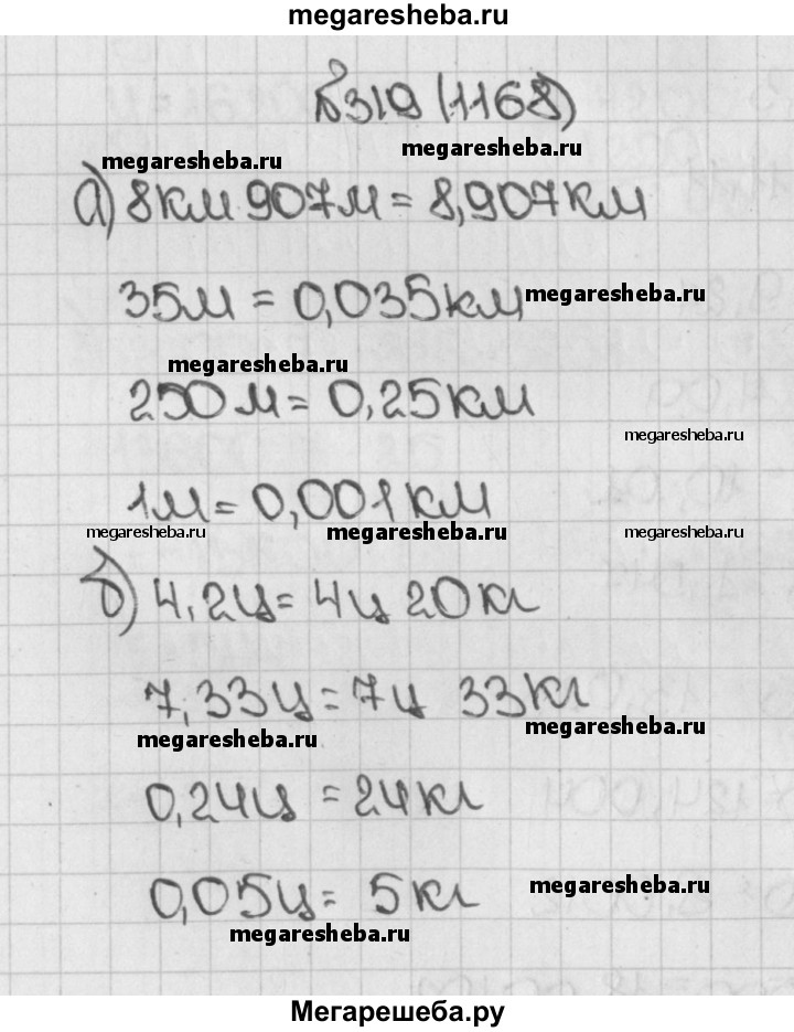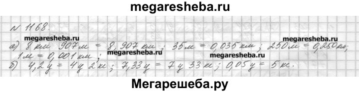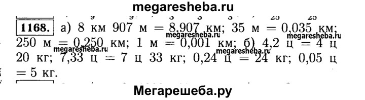 1168. Выразите: а) в километрах: 8 км 907 м; 35 м; 250 м; 1 м; б) в центнерах и килограммах: 4,2 ц; 7,33 ц; 0,24 ц; 0,05 ц.