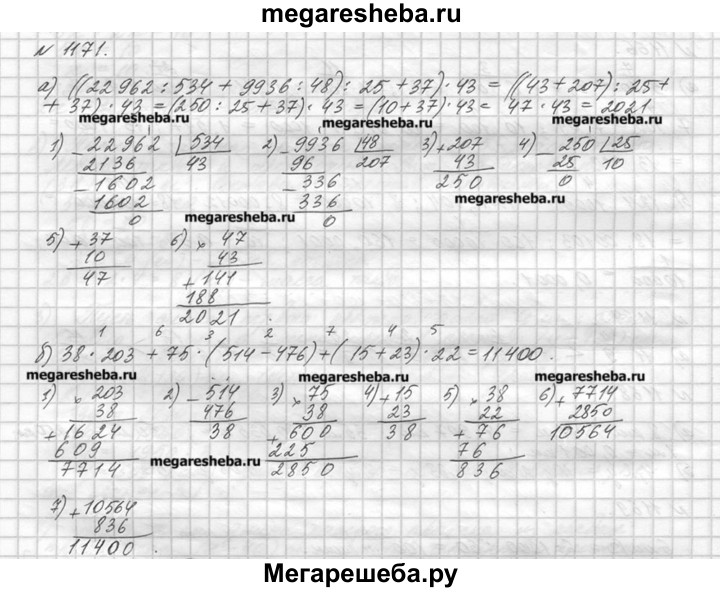 1171. Выполните действия: а) ((22 962 : 534 + 9936 : 48) : 25 + 37) * 43; б) 38 * 203 + 75 * (514 - 476) + (15 + 23) * 22.