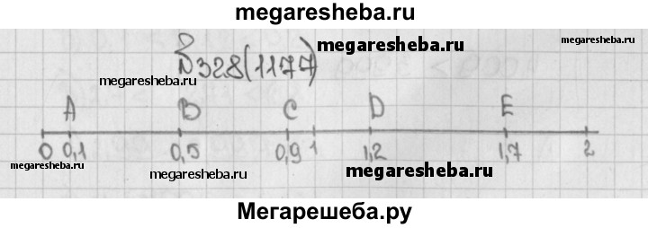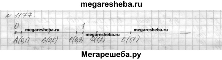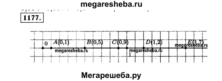1177. Примите за единичный отрезок длину десяти клеток тетради и отметьте на координатном луче точки А(0,1), В(0,5), С(0,9), D(1,2), Е(1,7).