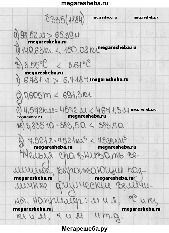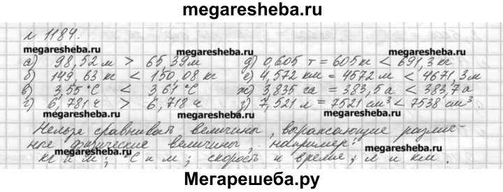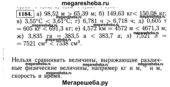 1184. Сравните величины: а) 98,52 м и 65,39 м; д) 0,605 т и 691,3 кг; б) 149,63 кг и 150,08 кг; е) 4,572 км и 4671,3 м; в) 3,55°С и 3,61°С; ж) 3,835 га и 383,7 а; г) 6,781 ч и 6,718 ч; з) 7,521 л и 7538 см3. Можно ли сравнить 3,5 кг и 8,12 м? Приведите несколько примеров величин, которые нельзя сравнивать.