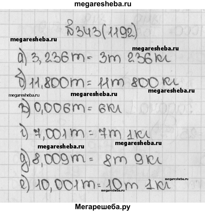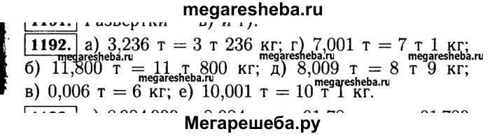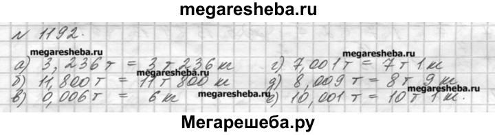 1192. Выразите в тоннах и килограммах: а) 3,236 т; в) 0,006 т; д) 8,009 т; б) 11,800 т; г) 7,001 т; е) 10,001 т.