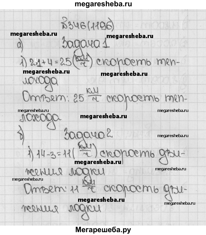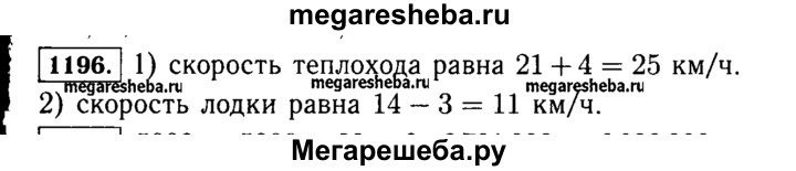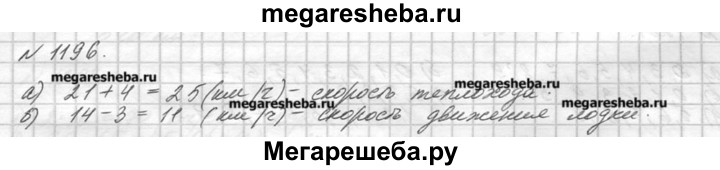 1196. Решите задачу: а) Теплоход идёт вниз по реке. Какова скорость движения теплохода, если скорость течения реки 4 км/ч, а собственная скорость теплохода (скорость в стоячей воде) равна 21 км/ч? б) Моторная лодка идёт вверх по реке. Какова скорость движения лодки, если скорость течения 3 км/ч, а собственная скорость лодки 14 км/ч?
